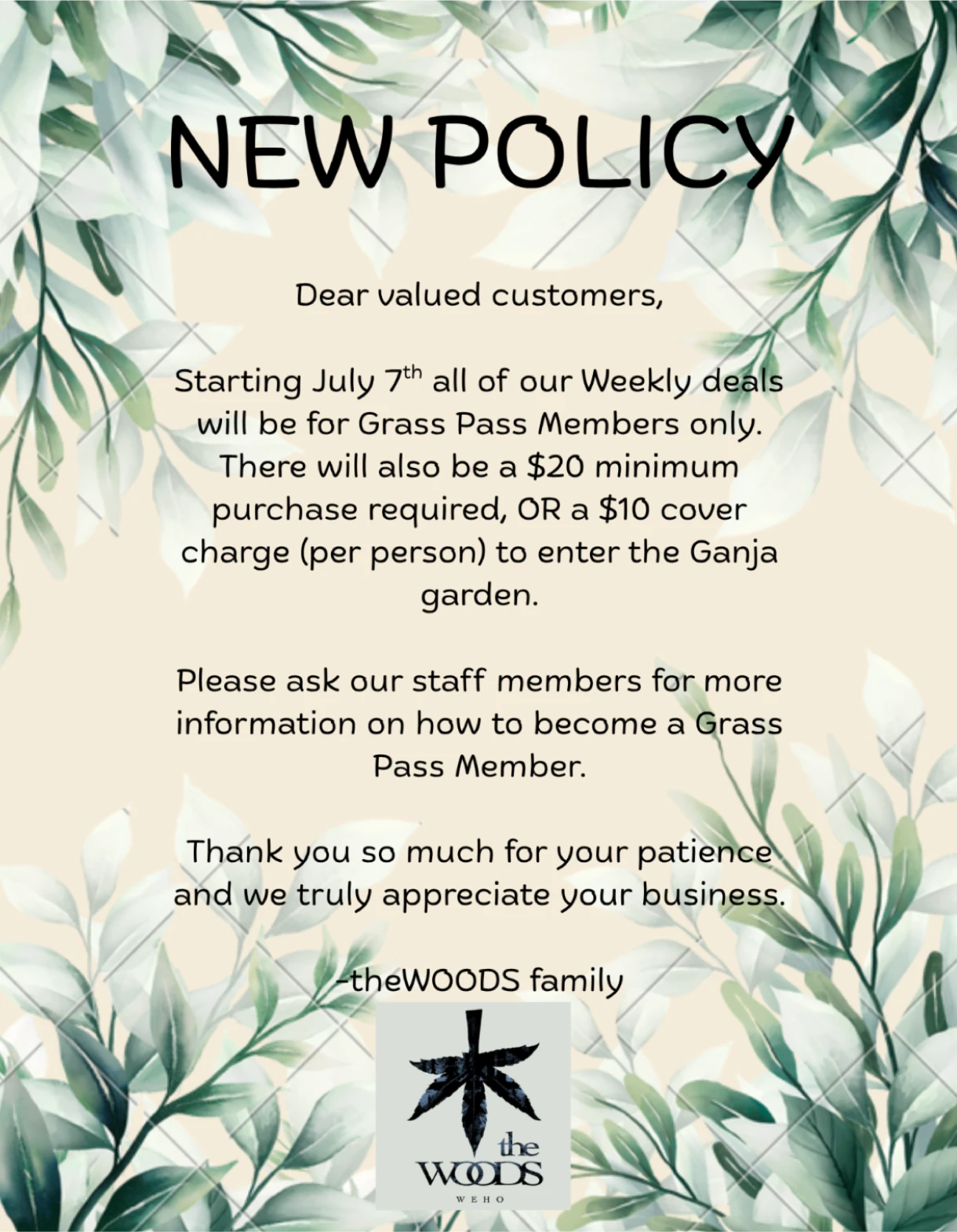 The Woods is a licensed cannabis dispensary and consumption lounge offering informed guidance for every level of cannabis experience. Guests may enjoy cannabis in our outdoor garden lounge or reserve a private cabana for a more intimate setting. Complimentary glassware and smoking accessories are available. The garden also features a THC consumption bar serving cannabis-infused beverages, alongside non-medicated coffee, tea, soda, and water. To maintain the integrity of the space, outside cannabis products, tobacco, and alcohol are not allowed.